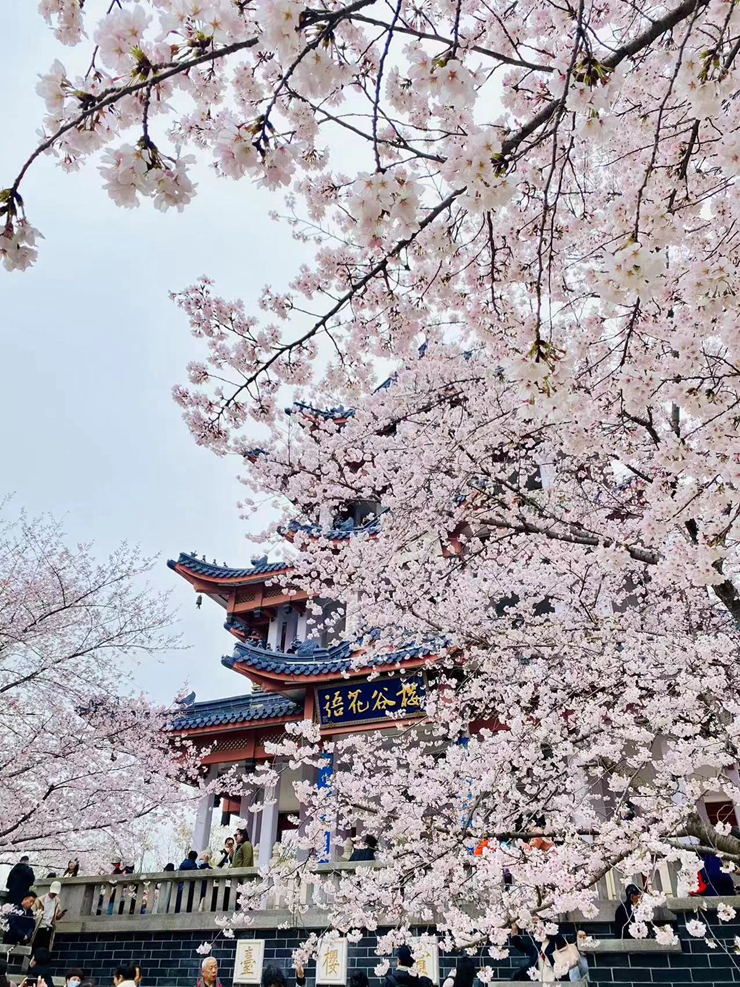 彼时,我们也终于来到了鼋头渚最著名的樱花谷。一走进樱花谷,听取“哇”声一片,铺面而来的樱花气息令人心驰神往。漫步在樱花大道上,两旁层层叠叠的淡粉色樱花从树枝开到树梢,一阵微风轻拂而起,树梢的风铃声声悦耳,无数的樱花瓣翩翩起舞,此情此景,美不胜收,令人心情舒畅,洗净所有俗世忧愁……